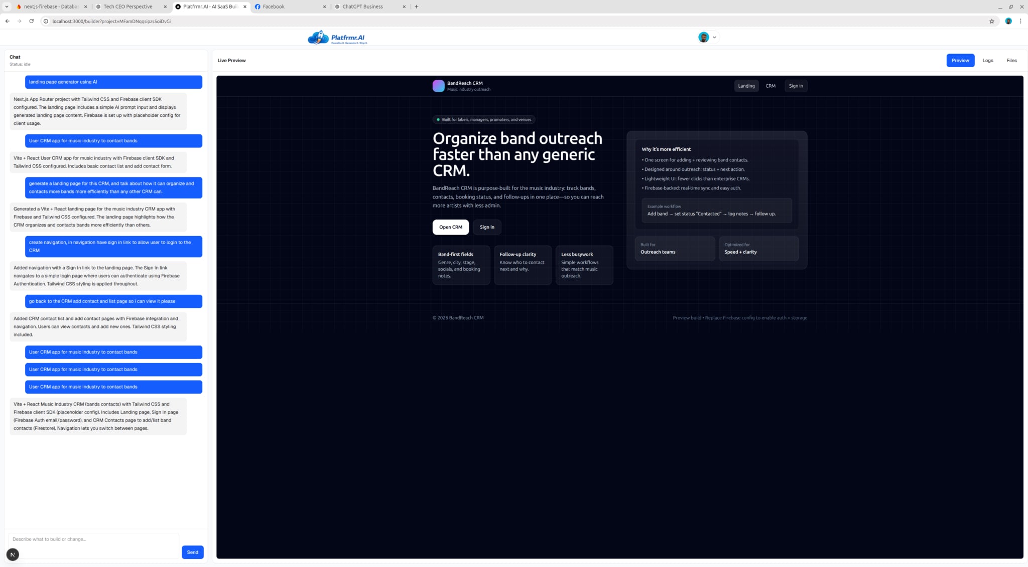 Auth, Stripe billing, Firebase config, routes, and UI are all generated instantly from your conversation.